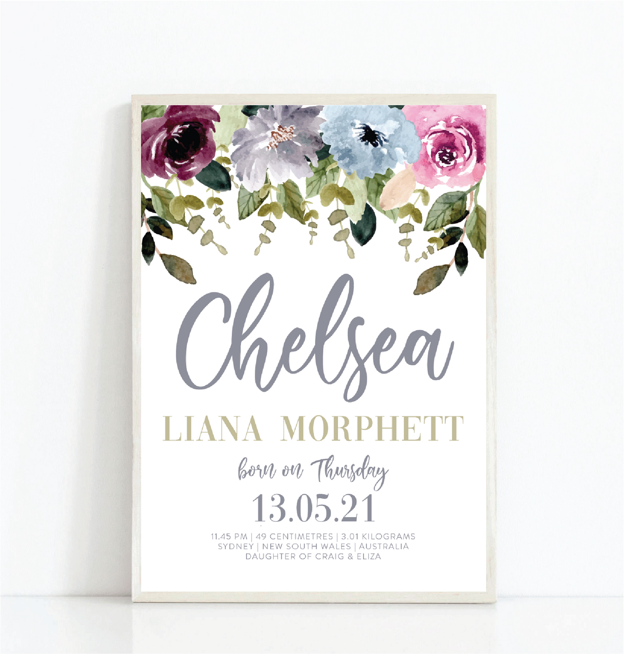 A beautiful birth print with stylish typography showcasing a baby's key birth information. This features a beautiful plum wild flowers to deliver a chic boho natural aesthetic. This makes a perfect present for a baby, or a special key piece in your child's bedroom. The tones in this print are stunning, especially when paired with rattan pieces, classic white furniture or even wooden style nursery decor.